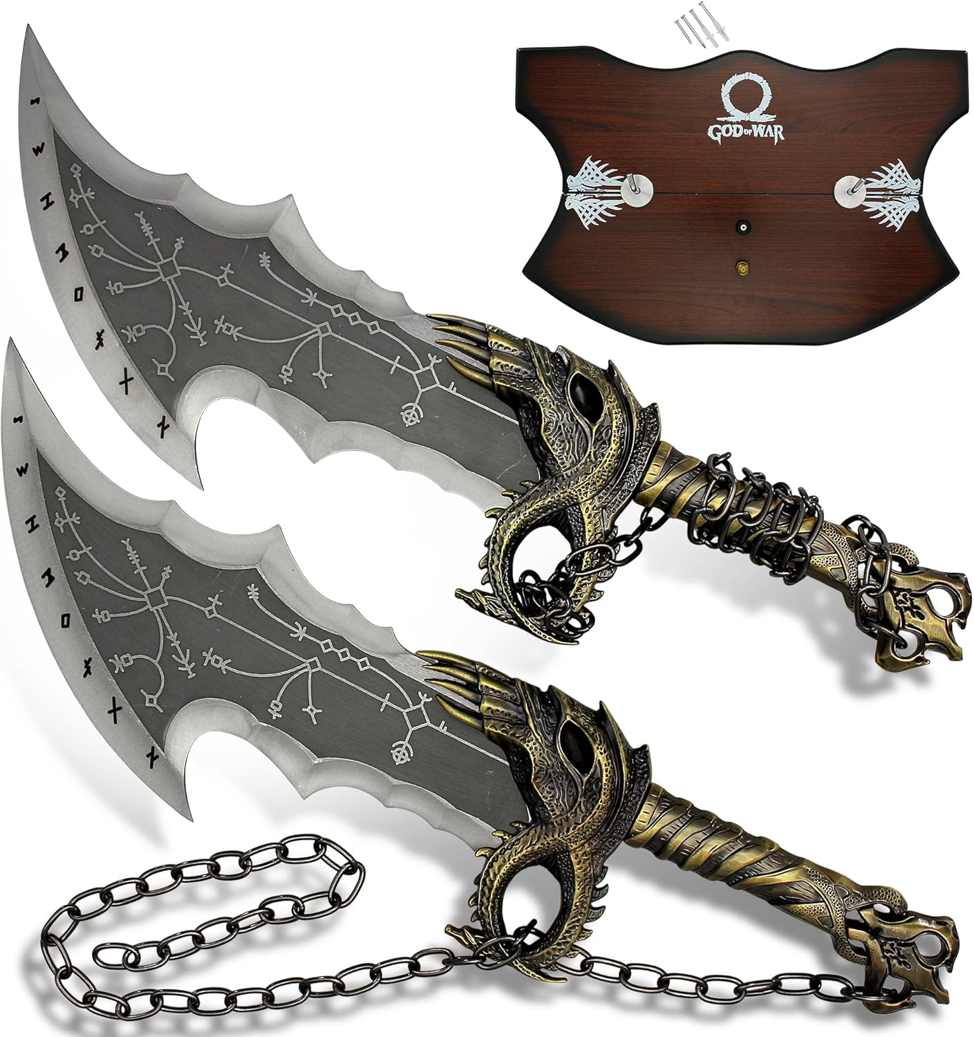 Blades of chaos twin blades with stainless steel blades, zinc alloy handles, and wooden display plaque