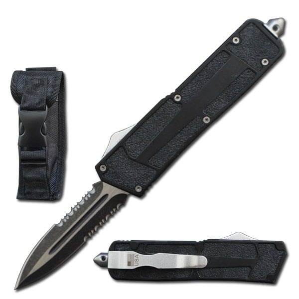 This exquisite OTF knife features a stone washed finish stainless steel drop point partially serrated blade. The dual action allows you to use a slider trigger...