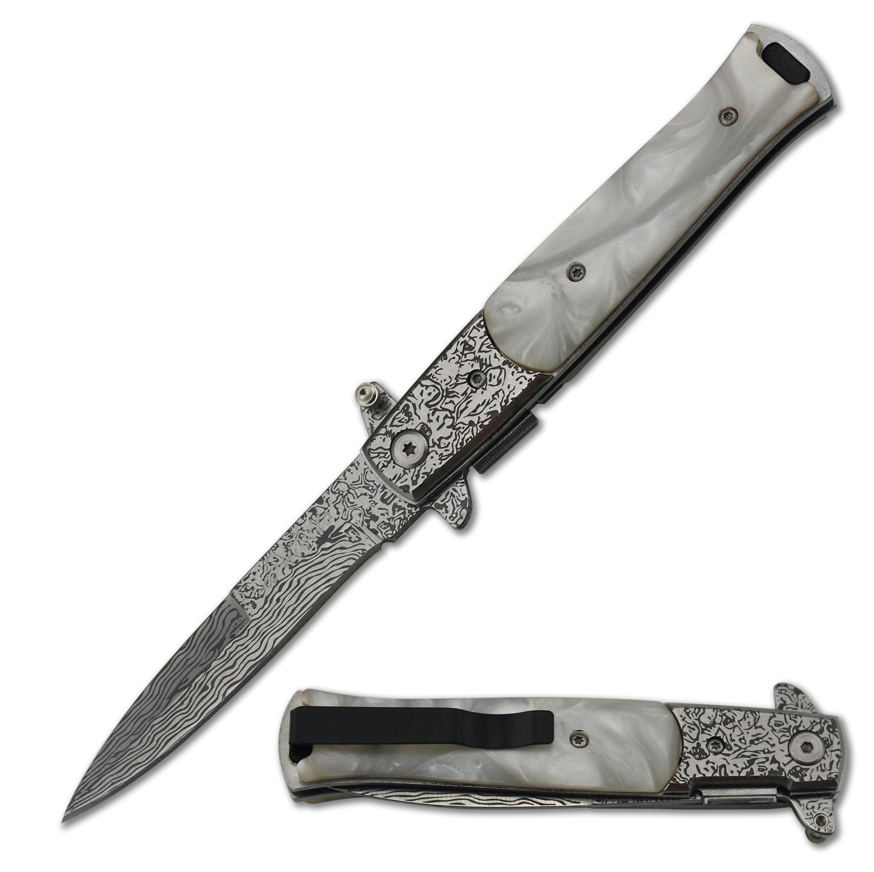• 5" stiletto style damascus acid edge spring assist knife with white pearl handle